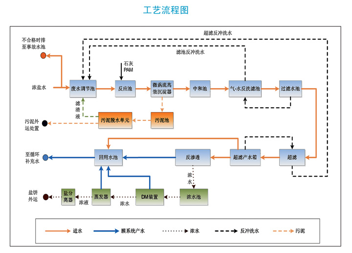 本公司采用預處理+二級反滲透+DM裝置技術+低溫高效蒸發(fā)工藝。 該工藝集技術性、可靠性、環(huán)保性、經濟性為一體,與其它工藝更 具有優(yōu)勢成為目前成熟的工業(yè)水處理技術之一。